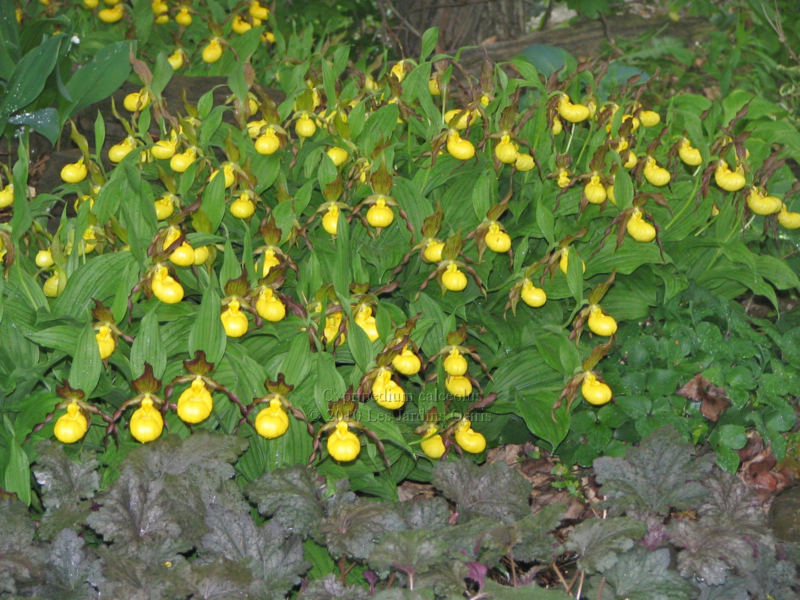 CYPRIPEDIUM calcéolus (Sabot de la vierge). Brunâtre à labelles jaunes (5-6) 40-60 cm. Sol riche et frais. Mi-ombre, ombre.Photo 1600