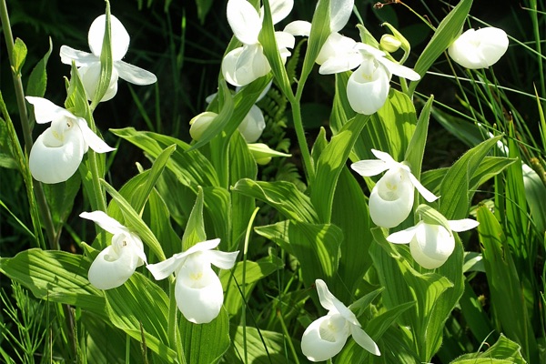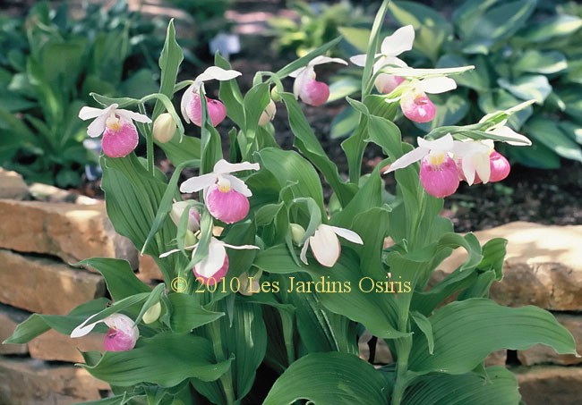 CYPRIPEDIUM regineae (Cypripède Royal). Avec ses fleurs d'un blanc pur ornées de rose (5-6) 40-75 cm, cette orchidée indigène est considérée comme la plus belle des orchidées qu'on retrouve au Québec. Sol riche en matières organiques et frais. Mi-ombre, ombre.