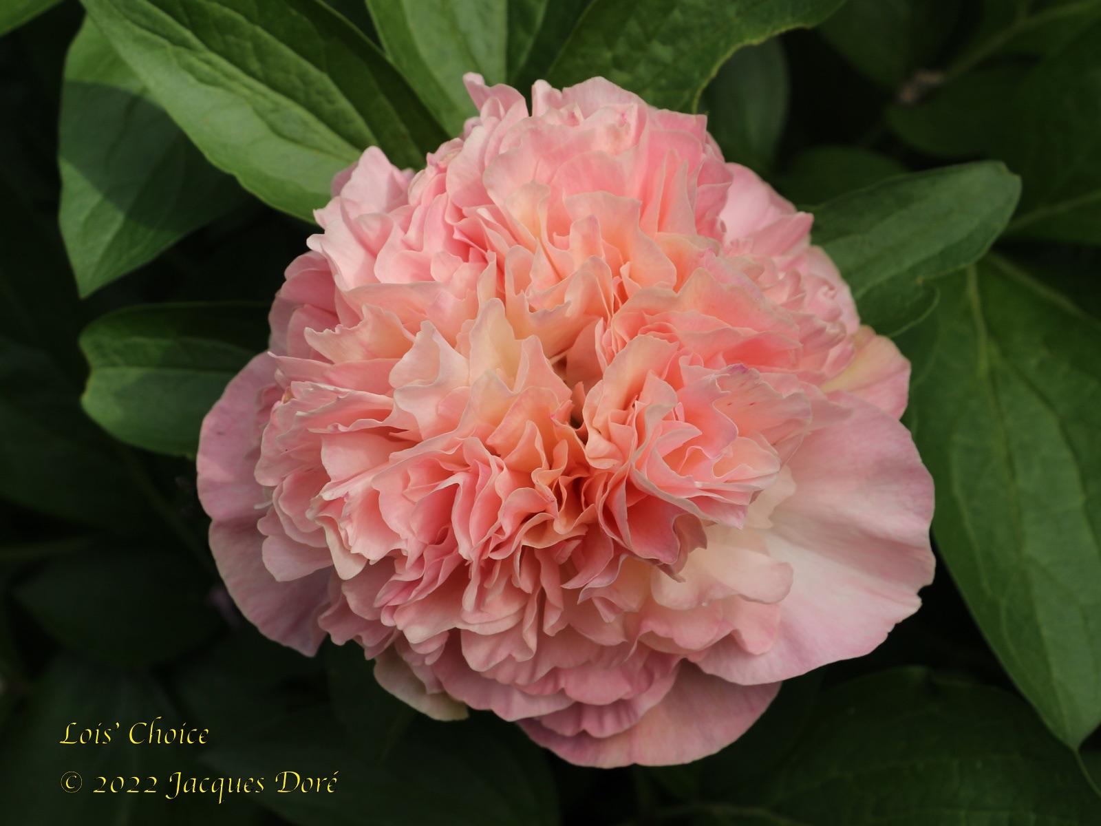 LOI'S CHOICE. Double. Fleur spectaculaire de teinte unique s'ouvrant sur des teintes rose pâle, abricot et jaune pâle tournant au rose foncé. Hâtive-mi-saison. Photo 1600 |