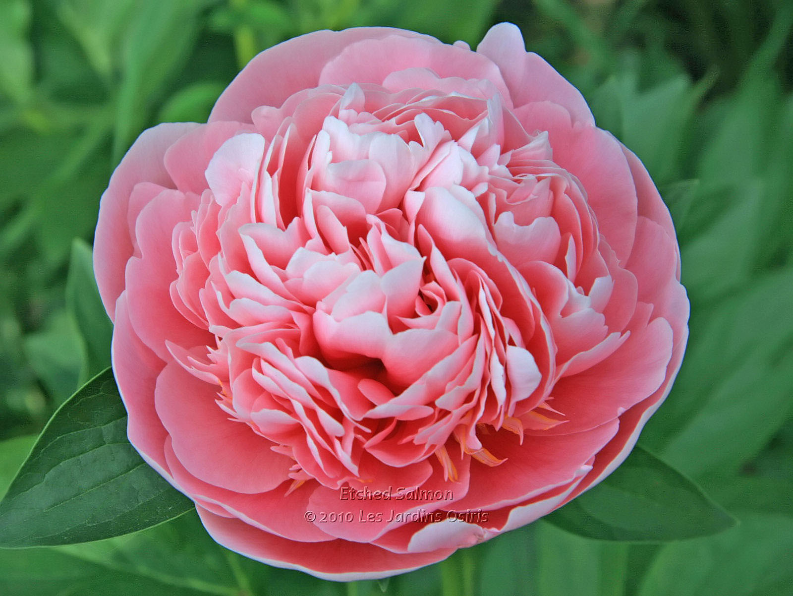 ETCHED SALMON. Double. Une collerette de pétales rose saumoné entourant un cœur de petits pétales plus étroits. Bon parfum. Mi-saison. Fleur 1600 Plant1600 |