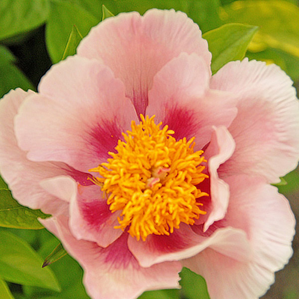 GOLDEN FROLIC. Simple. Voyante fleur rose pâle avec macules rose-rouge en contraste au centre de la fleur . Feuillage printanier jaune-vert. Hâtive. 75 cm. |