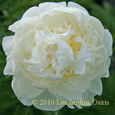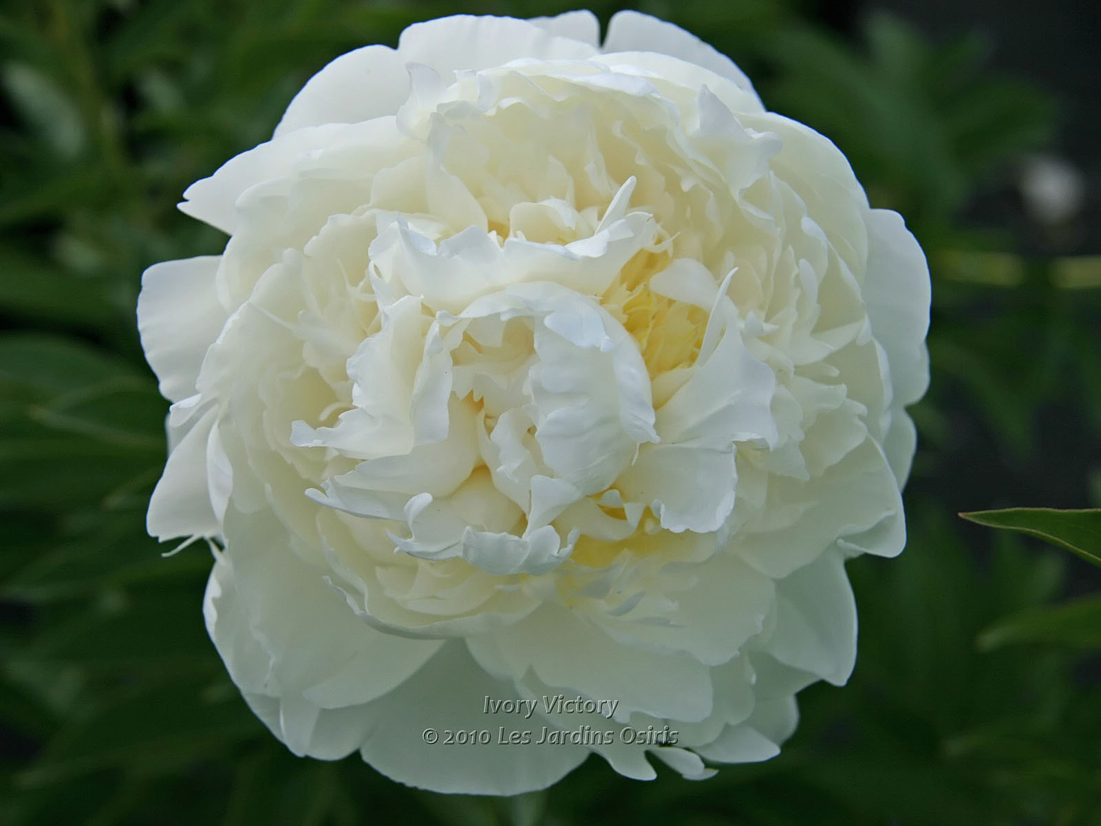 IVORY VICTORY. Pivoine double bombée. Corolle de pétales blanc ivoire contenant un cœur de pétaloïdes jaune crème. 90 cm. Mi-saison. Photo 1600 |