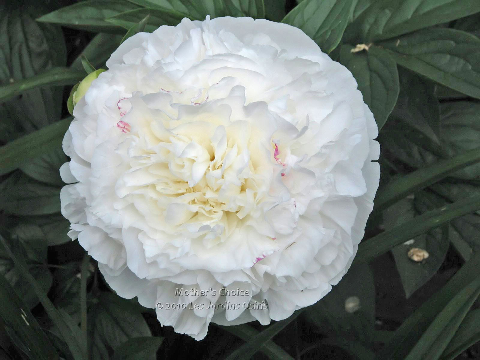 LILLIAN WILD. Très grandes fleurs doubles de teinte rosée à l'ouverture devenant blanc pur. Une des plus grandes et compactes fleurs doubles. Tiges solides. Mi-saison-tardive. |