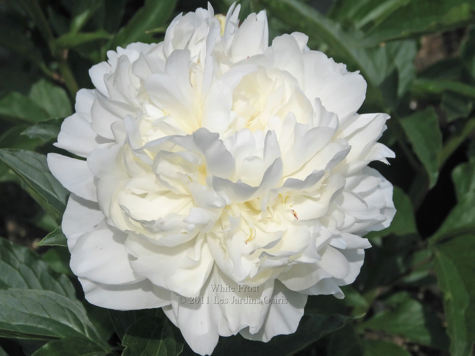WHITE FROST. Pivoine double, bombée. Corolle de pétales blanc pur surmontée de plus petits pétales au centre. Tige solide. Parfumée. 75 cm. Photo 1600 |