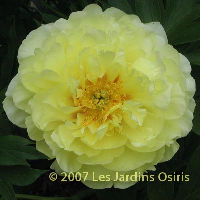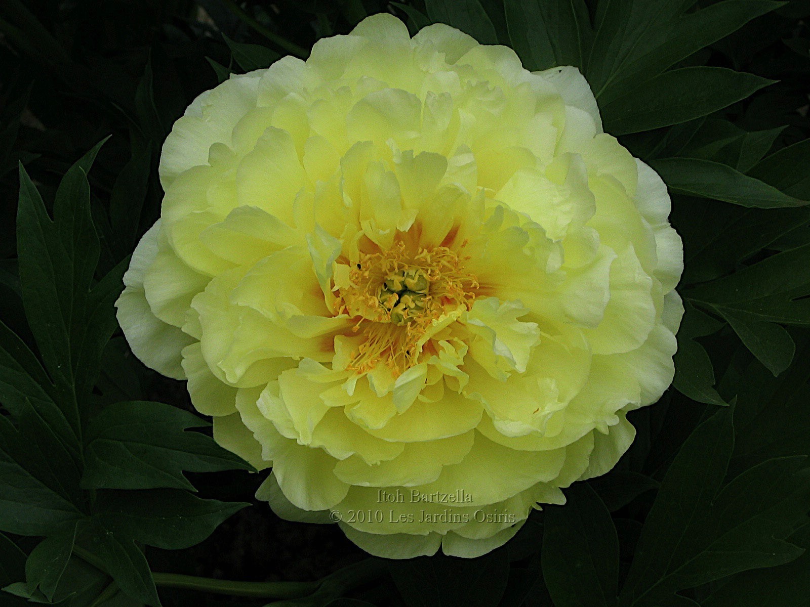 BARTZELLA. Fleur semi-double à double. Plant vigoureux qui supporte très bien les larges fleurs érigées, d'un jaune citron. Stigmates blancs. Petit cœur d'étamines jaunes. Parfumée à maturité. Les fleurs atteignent plus de 22 cm de diamètre. Mi-saison. 120 cm et plus. Photo 1600