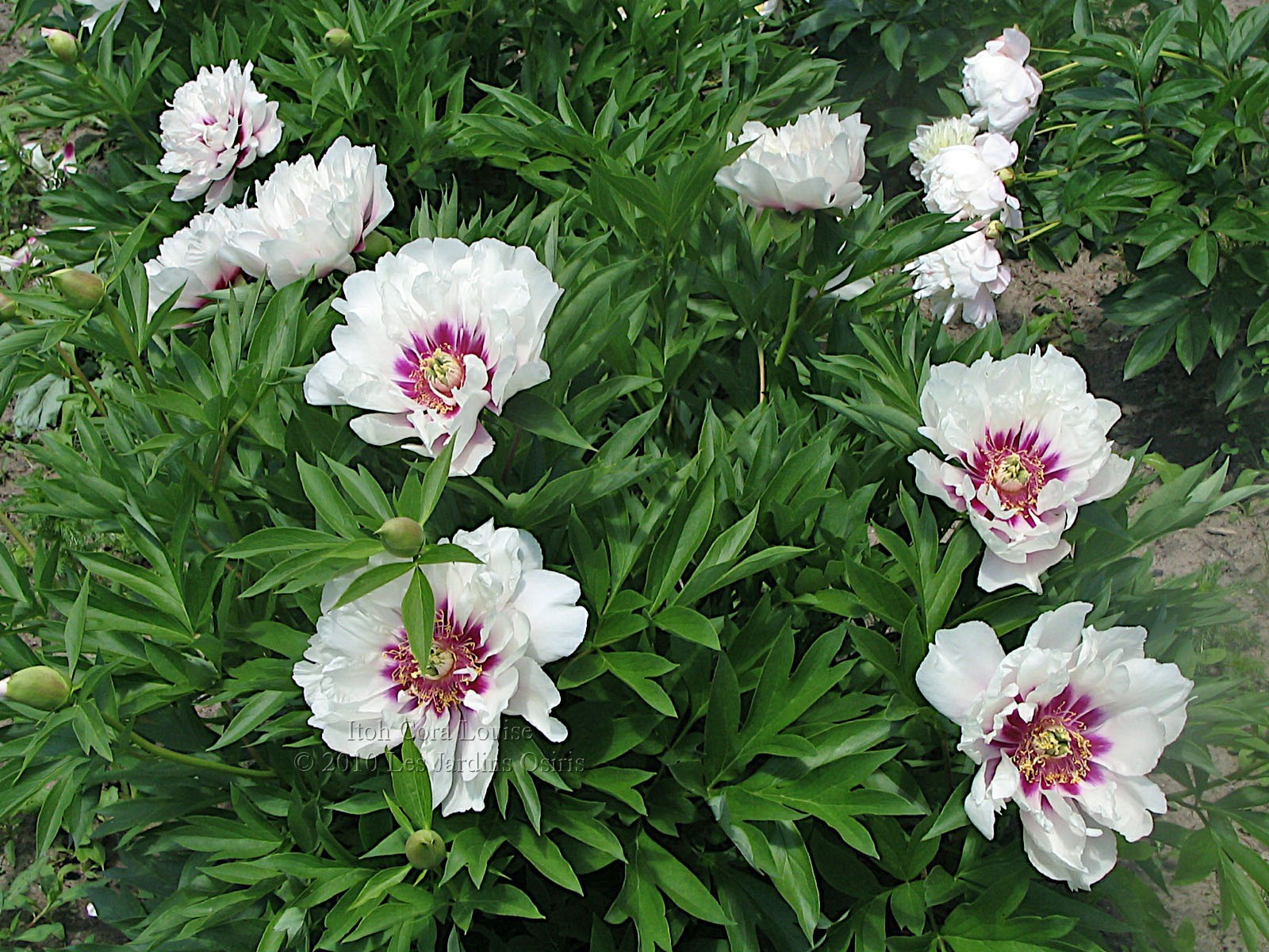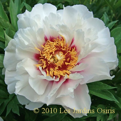 CORA LOUISE. Semi-double à double. Grande fleurs blanches avec des macules pourpres à la base des pétales. Étamines clairsemées jaune pâle sur longs filaments pourpres. Mi-saison, tardive. 90 cm. Photo 1600
